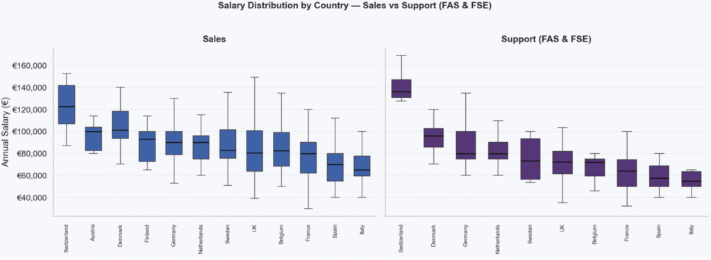 Sales roles usually have the highest earning potential (base). Technical field roles (FSE/FAS) vary depending on territory size, installed base, and market importance. Support roles pay less but are more stable and show less regional variation.